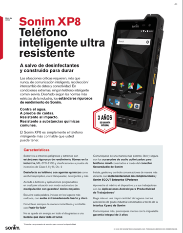 El Sonim XP8 es un teléfono inteligente robusto diseñado para resistir condiciones extremas, construido para ser extremadamente resistente, es a prueba de agua, polvo y golpes. Cumple con los estándares militares MIL-STD-810G y tiene certificación IP68.